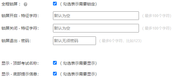 这两项,都是对界面显示的个性化设置,不影响考试。但如果不显示底部提示信息,则前面的 [ 锁屏退出 ] 无效。